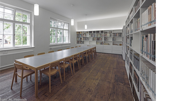 Ein ursprünglich als Werkstatt genutzer Raum, der Bankraum, ist als Lesesaal und Bibliothek umfunktioniert. Der alte Werkstattboden prägt den Charakter des Raumes und wurde bewusst erhalten, lediglich gereinigt - nicht abgeschliffen. Das von abp architekten entworfene Einbaumobiliar, sowie auch alle weiteren Oberflächen des Raumes sind ganz in weiß gehalten, um die Wirkung des Bodens zu stärken. Die für den Saal konzipierten Tische sind aus geöltem Eichenholz mit einer Nutzfläche aus Linoleum erstellt.