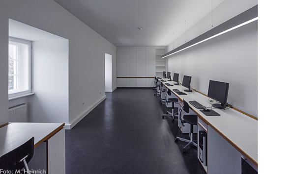 Ein ursprünglich als Lager genutzer Bereich ist als EDV-Lehrsaal umfunktioniert. Der neu verlegte dunkle Linoleumboden im Kontrast zu dem eigens konzipierten weißen Einbaumobiliar prägt den Charakter des Raumes. Sichtbare Stirnseiten der Möbel aus geöltem Eichenholz und die zurückhaltende Beleuchtung geben dem Raum eine edle Anmutung.