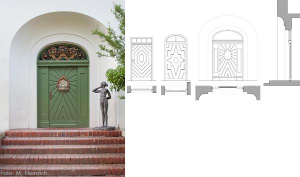Die denkmalgeschützten Außentüren wurden generell renoviert und wieder eingestellt. Als Maßnahme zur energetischen Optimierung ist in den Stockrahmen der Oberlichter und in den Türrahmen eine Nut zur Aufnahme einer Schlauchdichtung eingefräst worden. Darüber hinaus ist von unten in die Türblätter eine Absenkdichtung eigesetzt worden. Der Einbau der Dichtungen wirkt sich positiv auf die Reduzierung von Wärmeverlusten aus.