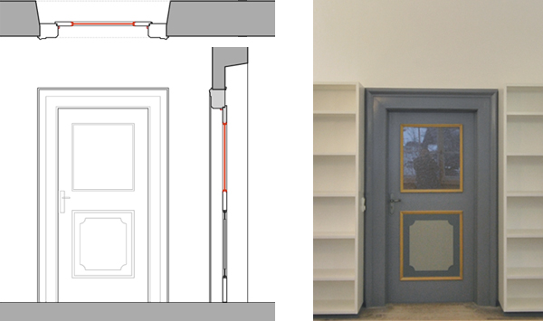 Die historischen Innentüren wurden generell renoviert und wieder eingestellt. Hinsichtlich des vorbeugenden Brandschutzes sind die Füllungen der Holzrahmentüren zum Teil aufgedoppelt und Glasfüllungen mit G30-Brandschutzverglasung ertüchtigt worden. Die Türen mussten mit Türdichtungen versehen werden. Dafür sind am Türstock schmale Leisten mit Nut und Dichtung aufgesetzt. Aus Gründen der Denkmalpflege wurde davon abgesehen, zur Aufnahme der Dichtungen eine Nut in die noch erhaltenen Türstöcke einzufräsen.