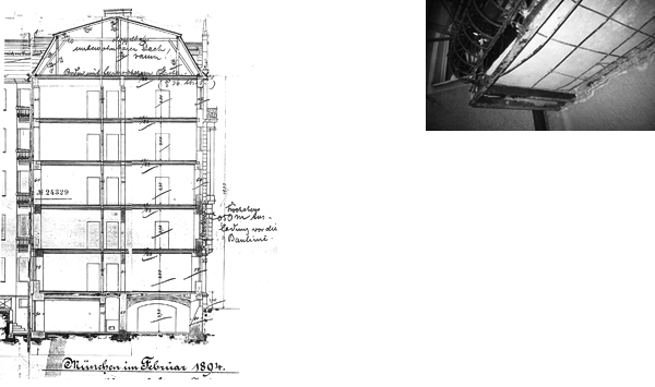 Auf der Innenhofseite mussten alle Balkonkragplatten abgebrochen und neu gesetzt werden, da die ausgefachte und verputzte Eisenträgerkonstruktion stark korrodiert war. Die neue, im Mauerwerk eingespannte Stahlträgerkonstruktion blieb unverputzt.