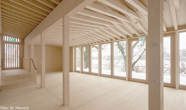 Der südlich angelagerte Neubau wird durch das sichtbare Holztragwerk aus eng strukturierten Sparren und die zum See orientierte Holz-Glasfassade geprägt und setzt sich damit von dem historischen Gebäude ab. Gleichzeitig wird mit der gewählten Materialität auf die regionale Besonderheit der landwirtschaftlich geprägten Strukturen verwiesen. Der westliche Giebel und die Fassaden der neuen Bauteile sind mit Lärchenschindeln verkleidet. Sie stärken das Ensembles mit den ebenfalls verschindelten Giebelfasaden der benachbarten Gebäude.