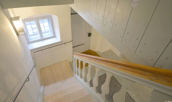 Bauliche Veränderungen des 20. Jahrhundert haben an dem denkmalgeschützten Gebäude, desen Ursprünge bis ins 16. Jahrhundert zurückreichen, zu erheblichen Verlusten an historischer Bausubstanz und der Ausstattungen geführt. Die verbliebenen wertvollen Bauteile wurden deshalb bewusst herausgearbeitet um die Geschichte des Hauses erlebbar zu machen. Auf eine sorgfältige handwerkliche Ausformung im Detail wurde großer Wert gelegt. Die Fenster wurden als Kastenfenster mit Klappläden erneuert.t. Die Kontinuität der Veränderungen der Jahrhunderte findet in den zurückhaltenden Ergänzungen ihre Fortsetzung..