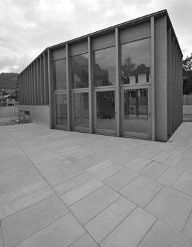 Der Vorplatz des Ausstellungspavillons ist mit großformatigen Platten aus hellgrauem Betonstein belegt. Dieser Vorbereich wird in Ergänzung zum Pavillon als temporäre Ausstellungsfläche genutzt.