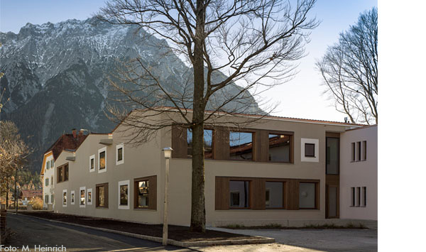 Eine giebelständige Bauweise prägt das Ortsbild von Mittenwald. Diese Typologie wird mit dem Schulerweiterungsbau aufgenommen und zeitgemäß umgesetzt. Der Neubau vermittelt zwischen dem denkmalgeschützten ehemaligen Forstamtsgebäude, das zukünftig als Schulverwaltung genutzt wird, und den bestehenden Wekstattgebäuden der Schule.