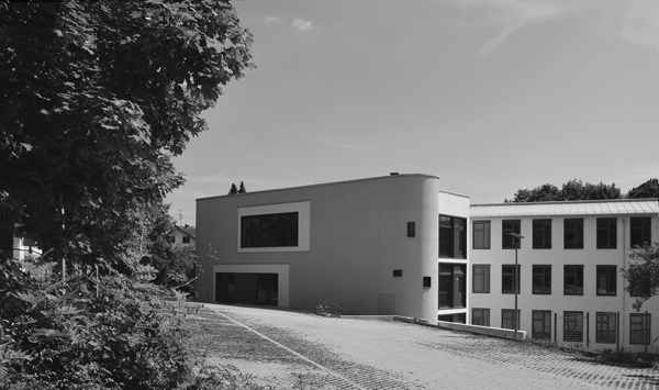Das Schulzentrum am Starnberger See ist durch angelagerte Elemente an einen Hauptbaukörper geprägt. Diesem Konzept folgt auch der Erweiterungsbau. Die Hanglage ausnutzend, erscheint der angelagerte Neubau straßenseitig nur zweigeschossig und gibt den Blick - über die abgerundete Form hinweg - auf die Landschaft frei. Die Nebenräume im nördlichen Gebäudeteil sind zur Straße gerichtet, die wesentlichen Nutzflächen orientieren sich mit einer großzügigen dreigeschossigen Glasfassade zum Park und zum See.