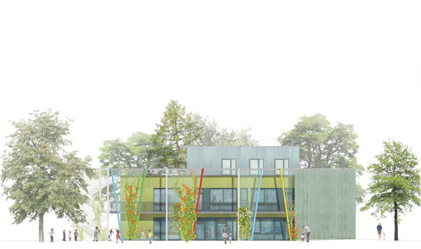 Konzeption Der Neubau des Kindergartens auf dem parkartigen Gelände berücksichtigt weitgehend den vorhandenen Baumbestand. Die Konstruktion erfolgte in massiver Holzbauweise. 12346