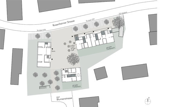 Durch die Umstrukturierung im früher von landwirtschaftlich genutzten Gebäuden geprägten im Ortszentrum von Schechen sind freiliegende Flächen neu zu überplanen. Die städtebauliche Konzeption sieht die Gruppierung von drei Gebäuden um einen öffentlichen Platz vor. Die Neubebauung greift den Maßstab und die Bauform der benachbarten, langgestreckten Höfe auf und fügt sich nahtlos ins Ortsbild ein.
